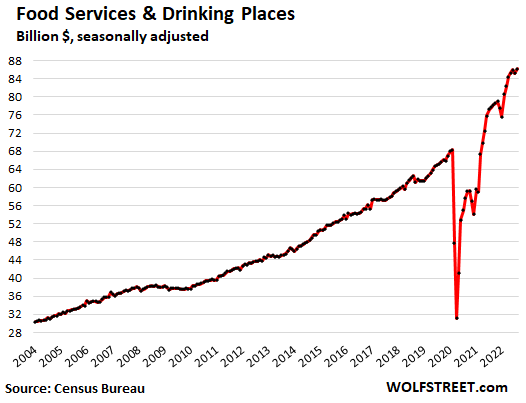 Food services and drinking places: Sales jumped by 1.1% in August from July, and by 10.9% year-over-year, to a record $86 billion. This was up by 32% from August 2019. Included here are bars, restaurants, cafes, cafeterias, delis, fast-food places, etc.