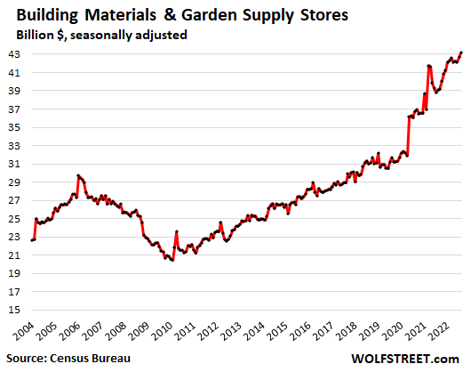 Building materials, garden supply and equipment stores: Sales jumped by 1.1% for the month, and by 10.5% year-over-year, to $43 billion, seasonally adjusted, up by 36% from August 2019: