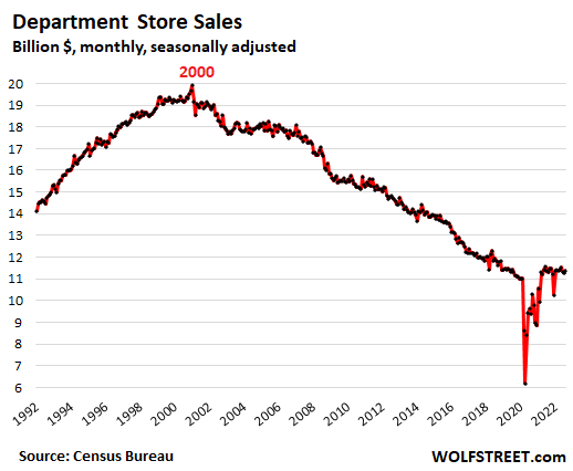 Department stores: Sales rose by 0.9% for the month, and by just 0.7% year-over-year, and were essentially flat with August 2019, at $11.4 billion. Compared to peak-department-store in 2000, sales were down 43%. Numerous department stores, from Sears on down, filed for bankruptcy and mostly vanished. Anything you can buy at a brick-and-mortar department store, you can buy online, including at that chain’s website, and that’s where these sales went: