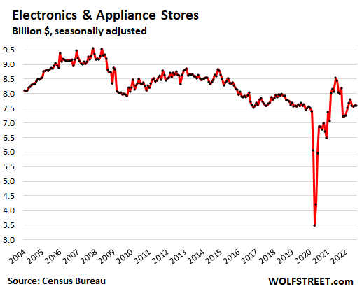 In this category are only specially electronics and appliance stores, such as Best Buy’s brick-and-mortar stores or Apple’s brick-and-mortar stores. It does not cover other retailers that sell electronics and appliances, and it does not cover ecommerce sales of electronics and appliances. This brick-and-mortar category is also on the slow way out, with sales today down 15% from where they’d been 15 years ago: