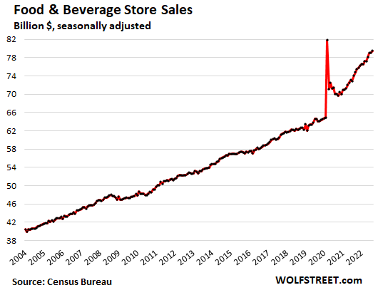 Food and Beverage Stores: Sales rose 0.5% for the month, and 7.2% year-over-year, to $79.5 billion, up 23% from August 2019: