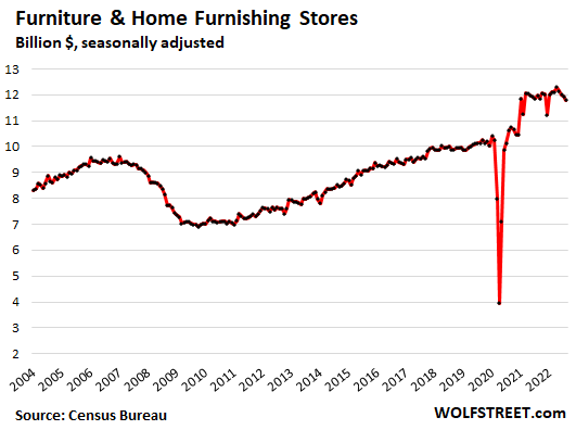 Furniture and home furnishing stores: Sales fell 1.3% for the month and 1.6% year-over-year, to $11.8 billion. This was still up 16% from August 2019:
