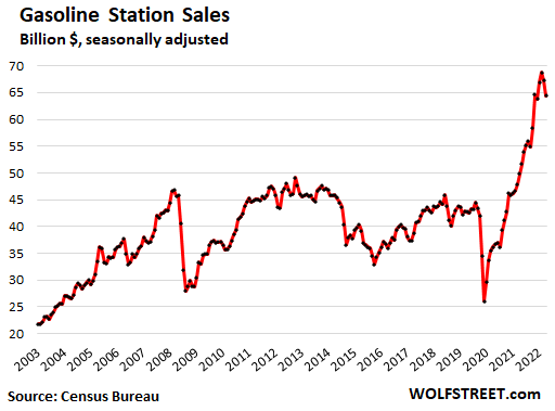 CPI for gasoline: -10.6% in August from July. But retail sales at gas stations include the other stuff they sell. Many gas stations are in effect convenience stores, selling food, beverages, and other stuff, and the drop in the price of gasoline was moderated by price increases in the other stuff they sell.
