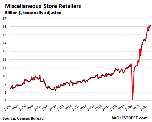 Miscellaneous store retailers (includes cannabis stores): Sales jumped by 1.6% for the month, by 15% year-over-year, and by 47% since August 2019, to $16.2 billion: