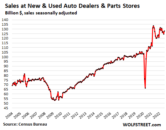 Sales at New and Used Vehicle and Parts Dealers, the largest category, jumped by 2.8% in August from July, and by 6.8% from a year ago, to $128 billion, seasonally adjusted. Compared to August 2019, sales were up 21%.