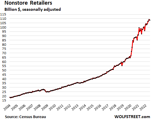 Sales at ecommerce and other “nonstore retailers” fell 0.7% from the record in July, to the second-highest ever, $108 billion, seasonally adjusted, up by 11% year-over-year and up by 70% from August 2019.