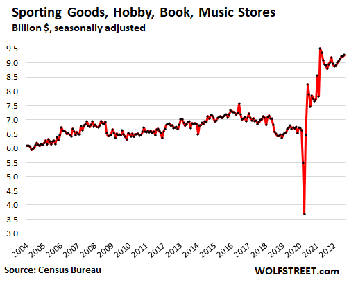 Sporting goods, hobby, book and music stores: Sales rose 0.5% for the month, and 5.5% year-over-year, to $9.3 billion, up 38% from August 2019: