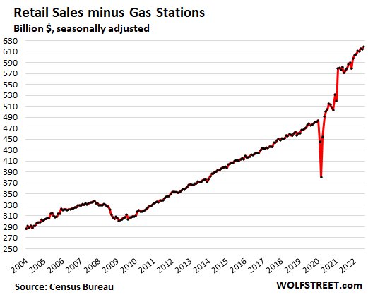 But retail sales without sales at gas stations jumped by 0.8% in August from July, and has been on a solid upward trend for months, even as inflation has shifted from goods, sold by retailers, to services, which are not sold by retailers.