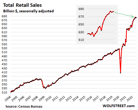 Retail sales track sales of goods, not of services. And inflation has been shifting from goods to services, and services inflation is now driving overall inflation (which I discussed a couple of days ago), even as some goods prices are coming down.