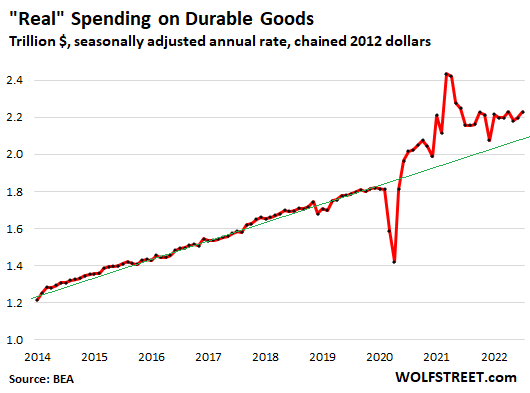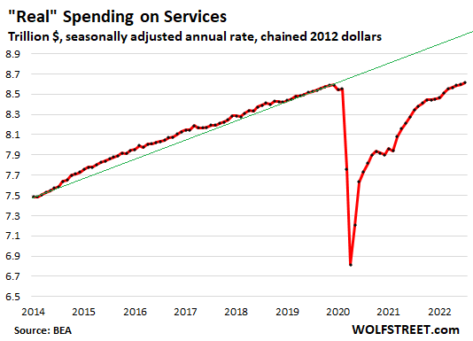 But retail sales without sales at gas stations jumped by 0.8% in August from July, and has been on a solid upward trend for months, even as inflation has shifted from goods, sold by retailers, to services, which are not sold by retailers.