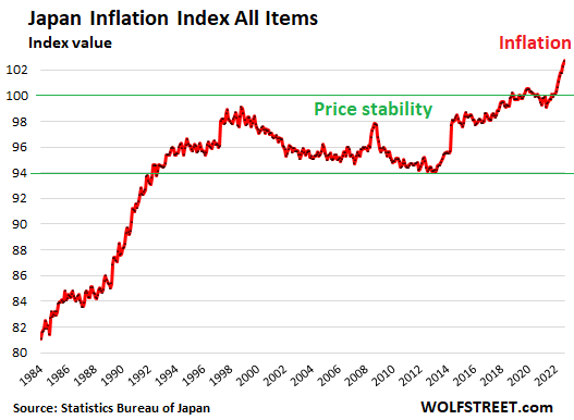 The “All items less fresh food” index – the measure the Bank of Japan uses for its inflation target of 2.0% – is up by 2.8% year-over-year and surging, and the BoJ is still blowing it off. Governor Kuroda will be out next April, and until then, he, the architect of Japan’s money-printing orgy and negative-interest-rate policy, will likely dig in his heels, keeping the policy rate at -0.1%.