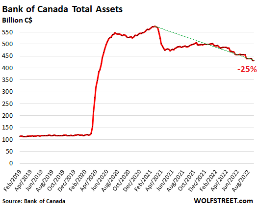 The BoC has also been unloading its balance sheet. Quantitative tightening is the opposite of quantitative easing, or “money printing,” and has the opposite effects on asset prices. Its total assets have fallen by 25% from the peak: