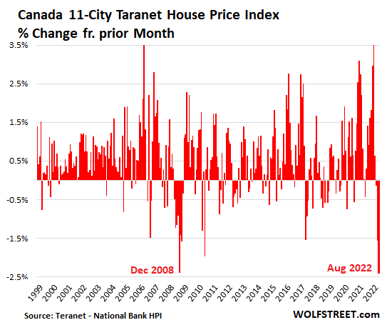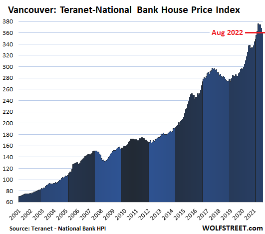 The overall 11-City Teranet-National Bank House Price Index plunged by 2.4% in August from July, the largest drop ever, together with the December 2008 Lehman-bankruptcy plunge. Over the past three months, the overall index is down 4.1%. This whittled down the year-over-year spike from the 19% range in March and April to 8.9%: