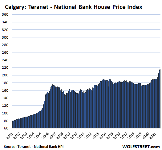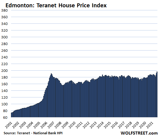 In Edmonton, also in Canada’s oil patch, house prices jumped by 2.7% for the month, bringing the year-over-year gain to 4.6%. Note how the oil-boom housing bubble that ended in 2007 turned into 15 years of essentially no price increases. Not much of a housing bubble here: