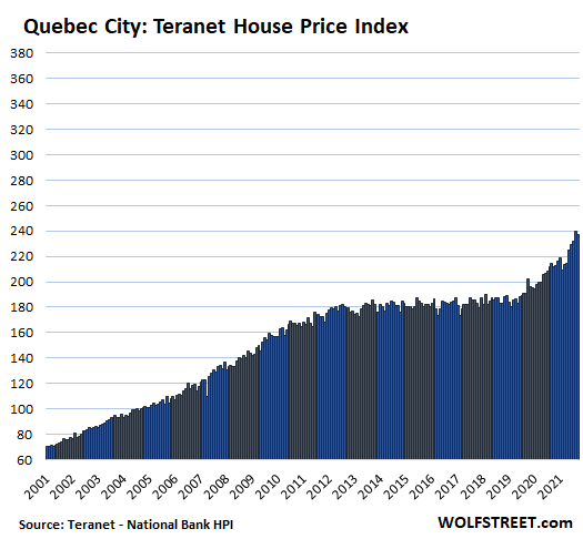 In Quebec City, house prices fell 1.1% in August from July, which had been the peak. This whittled down the year-over-year gain to 10.5%.