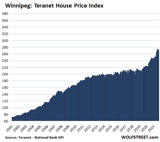 In Winnipeg, house prices fell 1.4% in August from July, which had been the peak, whittling down the year-over-year gain to 9%: