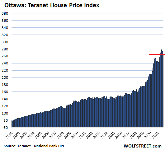 In Ottawa, house prices plunged 3.1% in August from July and by 4.6% over the two months from the peak in June. This slashed the year-over-year gain to 4.5%. Note the majestic late-to-the-party price spikes in March through May: