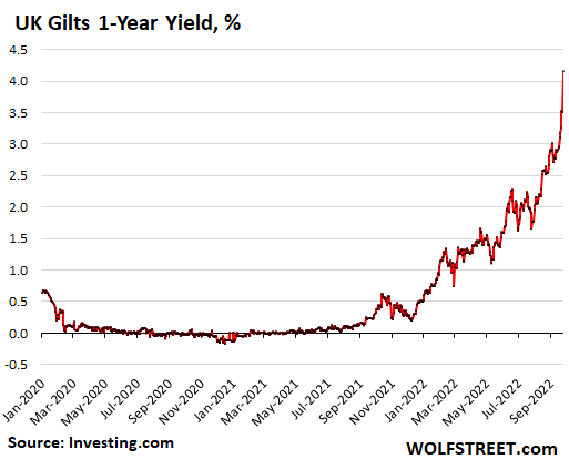The one-year yield on UK gilts spiked by a monstrous 65 basis points today to 4.16% at the moment, bringing the spike that started on Tuesday to 121 basis points. These are huge gigantic multiday moves: