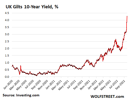 The yield on the 10-year UK government bond (gilts) spiked by 44 basis points, to 4.28% at the moment, bringing the spike since Tuesday last week to 113 basis points, as bond prices plunged: