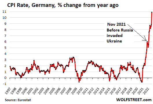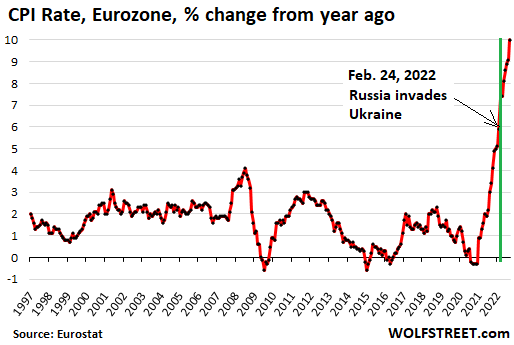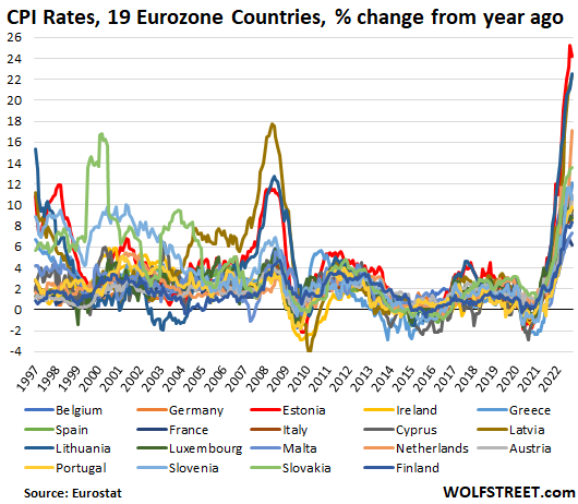 In Germany, where some of the government’s inflation subsidies expired, inflation spiked to 10.9% from 8.8% in August. Nine of the 19 Eurozone countries had inflation of 10% or more, including the three Baltic countries, at over 22%.