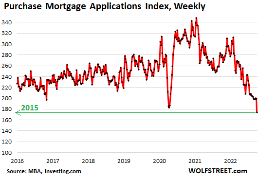 In the week ended September 30, demand for mortgages to purchase a home plunged by 13%, seasonally adjusted, from the already beaten-down levels in the prior week, according to the Mortgage Bankers Association today. Compared to the same week last year, purchase mortgage applications dropped by 37%. They fell through the lows during the lockdowns and hit the lowest level since October 2015! Purchase mortgage applications are an indication of housing demand over the next few weeks.