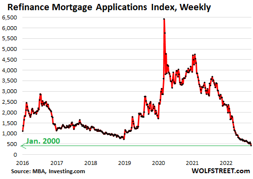 Applications for mortgages to refinance an existing mortgage plunged by 18% compared to the prior week, seasonally adjusted, and by 86% from a year ago, to the lowest level since January 2000. No homeowners in their right minds are going to refinance an old 3% or 4% mortgage with a new 7% mortgage, except to extract emergency cash, which will cost them dearly, and they might be able to accomplish the same for a lot less with a HELOC. So the HELOC business, which has totally died down since the Financial Crisis, should perk up again.