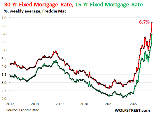 Freddie Mac’s weekly measure, released today, based on mortgage rates early this week, jumped by 41 basis points from the prior week, to 6.7%, the highest since 2007 (red line in the chart below). A year ago, it was 3.0%.
