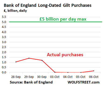The BOE plans to end the program on October 14, as initially announced. The BOE has purchased only £3.66 billion in bonds since the program started last Wednesday, with only £22 million purchased on Monday, zero on Tuesday and Wednesday, and £154 million today, after it purchased only £1.2 billion per day on average last week – far below the up to £5 billion per day amount that the BOE had initially announced. And the BOE is still planning to start QT by selling gilts on October 31. So far, this was a highly effective way to stem a panic that had taken on a life of its own, without actually buying much: