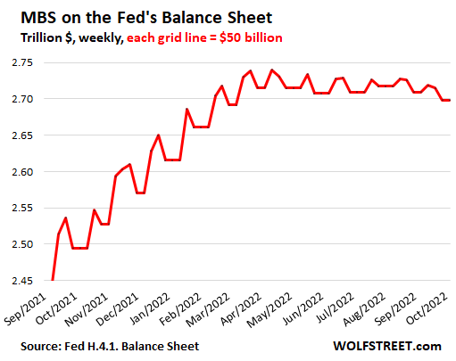 The MBS had one of those flat spots this week, at $2.698 trillion, down by $11 billion from September 8, and down by $42 billion from the peak on April 13.