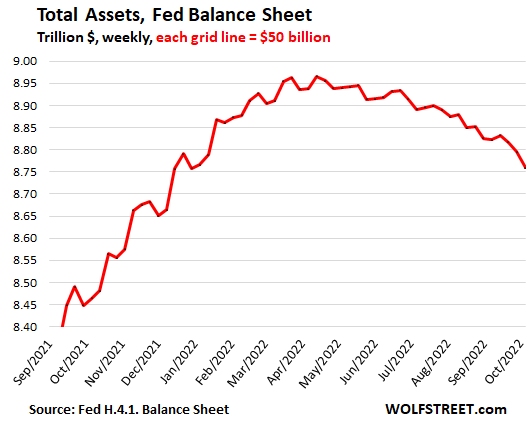 Total assets dropped by $37 billion from the prior week, by $63 billion from the balance sheet released on September 8, and by $206 billion from the peak on April 13, to $8.76trillion, the lowest since December 2021.