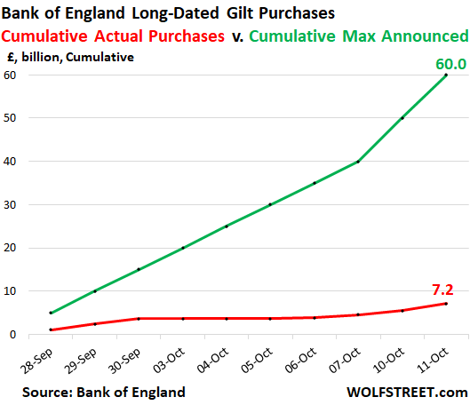 And yet, despite all the hoopla, the BOE has actually bought just a small fraction of the bonds that it said it might buy. In total, since September 28, the were 8 days of “up to £5 billion” per day in purchases and 2 days of “up to £10 billion” per day, for a total of £60 billion.