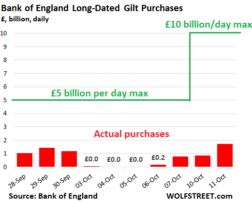 The Bank of England announced on September 28 that it would buy up to £5 billion per day in long-dated government bonds “to help restore market functioning and reduce any risks from contagion.” This was hugely ballyhooed as a “pivot” on the internet and in the US financial media. Yesterday it came out with an even more hugely ballyhooed announcement that it would double its potential bond purchases to £10 billion per day for the rest of the week. And today, it came out with an even more hugely ballyhooed announcement that it would “expand” the bond purchases. Throughout it maintained that it would “cease all gilt purchases” on Friday, October 14.