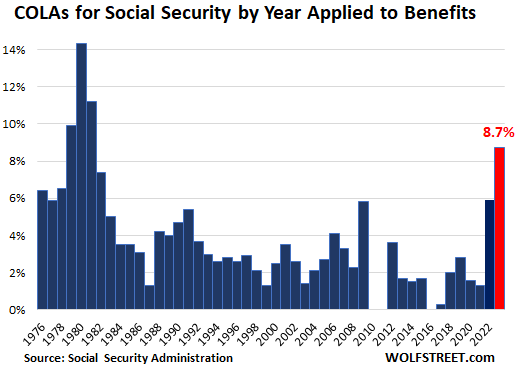 For September, the CPI-W jumped by 8.5% from a year ago, after the 8.7% jump in August and the 9.1% jump in July. The COLA for 2023 will be the average of the three: 8.7%, the highest since 1981.