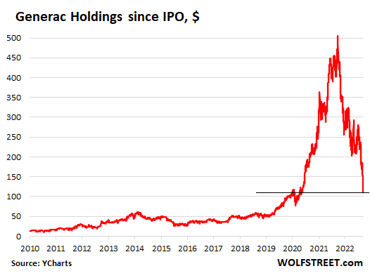 What’s interesting about Generac Holdings isn’t really what happened today, that the stock plunged 25% on another warning on earnings, revenue, and inventories, leaving the shares down by 79% from the peak of $524 on November 2, 2021; but that the shares multiplied by five from February 2020 through November 2021 in the first place, of which they’ve now given up all of it.