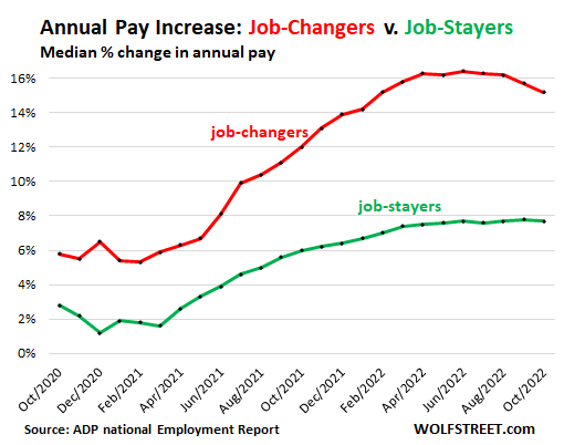 But some of the job-changer pay-exuberance has been fading just a tad in recent months, as annual pay increases, though still huge at 15.2% in October, are slightly down from the 16%+ range earlier in 2022.