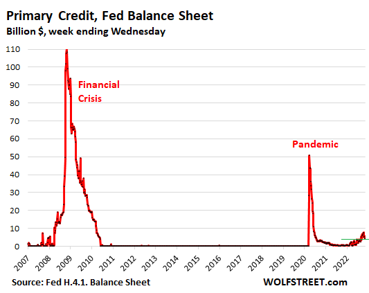 Just updated. Here is the borrowing at the Discount Window, and the current interest rate the Fed charges as of today = 4.0%