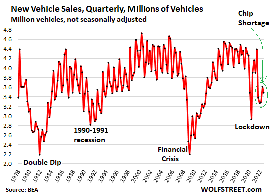 But in terms of the number of units delivered to the ultimate customer, new vehicles sales in Q3 plunged by 19% compared to Q3 2019. But sales had also been declining in the years before the pandemic. Compared to Q3 2016, sales were down by 22%. At 3.48 million vehicles, sales were back where they’d been in the late 1970s.