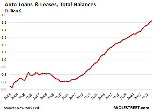 So balances of auto loans and leases increased by 2.2% in Q3 from Q2, and by 6.1% year-over-year, to a record $1.52 trillion, according to data from the New York Fed’s Household Debt and Credit Report, on a mix of surging prices, going upscale because that’s where the money is, and dropping unit sales, leading to fewer but bigger loans with longer terms:
