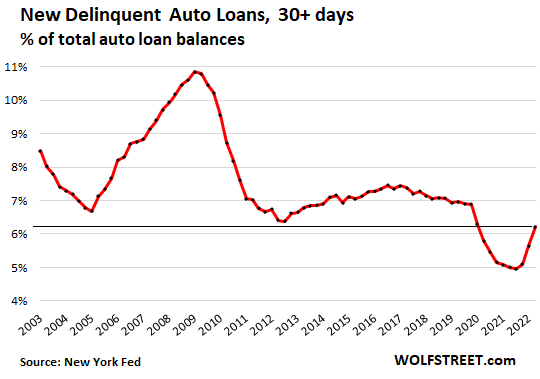The rate of all auto loans and leases – prime and subprime – that were 30 days and more past due rose to 6.2% in Q3, according to the New York Fed’s Household Debt and Credit data. This was still below the record lows before the pandemic.