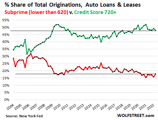 The share of subprime auto loans – borrowers with credit scores below 620 – that were originated in Q3 ticked up from record lows to a share of 17.8% of total auto loan originations in the quarter, and remained in the same low range of the past two years. Before the Financial Crisis, the share of subprime auto loans that were originated ranged between 25% and 30%-plus (red line).