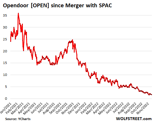 A relatively new development in the investor scenario is the i-buyer phenomenon where companies funded by investor money piled into the house flipping business. This phenomenon has already collapsed. Zillow abandoned it last year amid huge losses. Redfin threw in the towel this year. Opendoor, with nothing else to fall back on, has cut back its purchases. The company, which had gone public via merger with a SPAC in December 20202, lost $928 million in Q3, bringing its total loss since 2019 to $2.2 billion. And every house it bought it has to sell, and that turns out to be much harder than anticipated. Its shares, now at $1.64, have collapsed by 95% from their peak and are in my pantheon of Imploded Stocks: