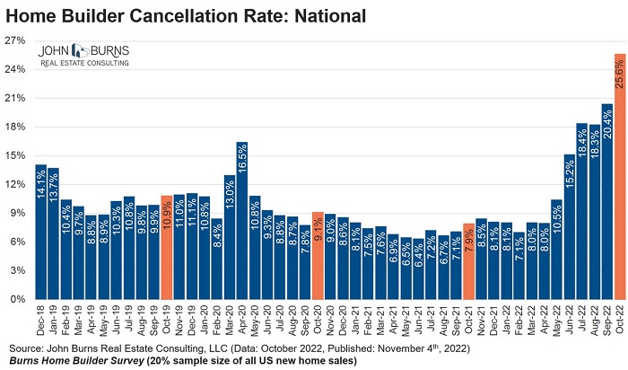 According to the homebuilder survey by John Burns Real Estate Consulting – with a sample size of roughly 20% of all new home sales – the cancellation rate spiked to 25.6% in October, up from a rate of 7.9% in October 2021 and from 10.9% in October 2019. Over a quarter of the signed contracts are cancelled! Chart via Rick Palacios Jr., Director of Research at John Burns (click to enlarge):