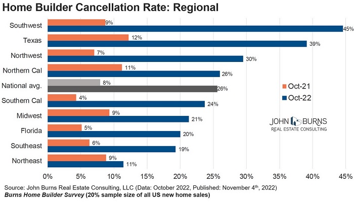 The cancellation rates vary substantially by region: In the Southwest, the cancellation rate spiked to 45%. Nearly half of all contracts signed are then cancelled! This was up from a cancellation rate of 9% a year ago. In Texas, the cancellation rate spiked to 39%, up from 12% a year ago.