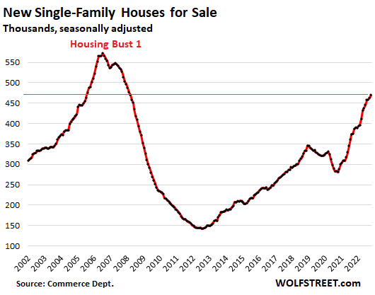 Inventory for sale in all stages of construction jumped to 470,000 houses, up by 21%, from the high levels in October last year, the highest since March 2008. Compared to the early phases of Housing Bust 1, it was the highest since September 2005: