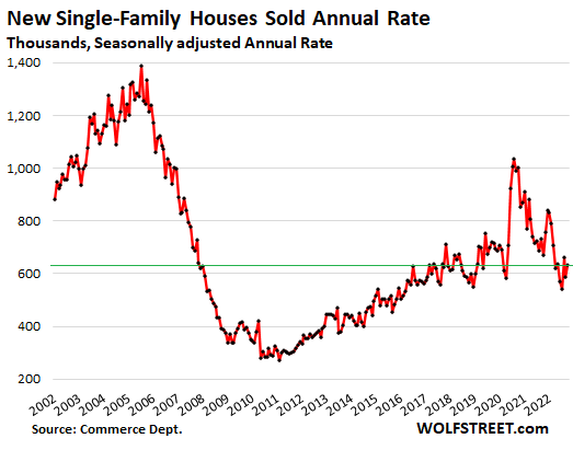 Sales of new single-family houses have been zigzagging along low levels for months. In October, they rose 7.5% from September, after having plunged 11% in September, according to the Census Bureau today. At a seasonally adjusted annual rate of 632,000 houses, they were down 5.8% from the already low levels a year ago, and down 37% from two years ago.