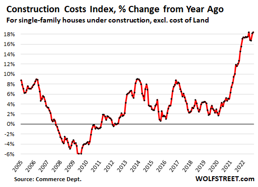 Construction costs of single-family houses – excluding the cost of land and other non-construction costs – seemed like they’d peaked in June, and then the spike slowed or stalled, and on a year-over-year basis, the spike backed off from a historic record of 18.3% in June to 16.7% in August. But then it started spiking all over again and in October hit a new historic record of 18.4%. This inflation will continue to dish up surprises, just when you least expect it.