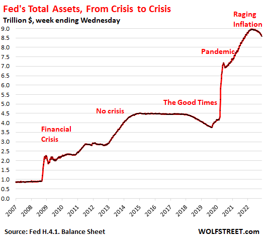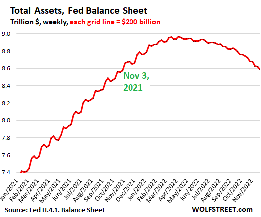 Since the peak in April, total assets on the Federal Reserve’s balance sheet dropped by $381 billion, to $8.585 trillion, the lowest since November 3, 2021, according to the weekly balance sheet released today, with balances as of November 30.