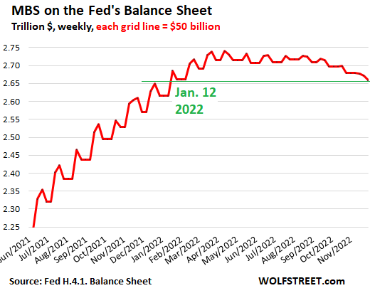 In mid-September, the Fed stopped buying MBS after having already cut its purchases to near nothing. Given the delays associated with MBS that the Fed bought in the To-Be-Announced market, the inflow of new MBS onto the balance sheet ended in October. These inflows are the upward zigs in the chart.