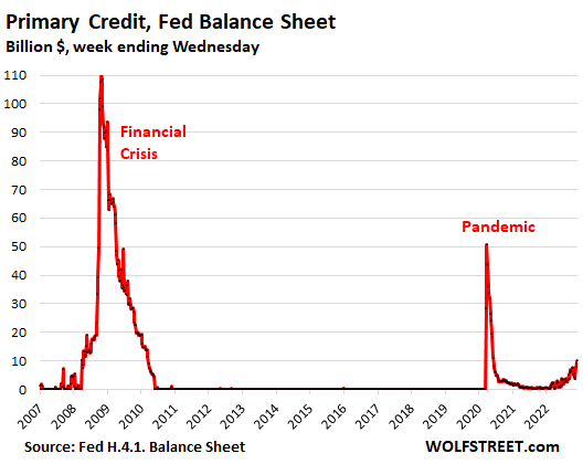 When the Fed started hiking rates in early 2022, Primary Credit began rising. On today’s balance sheet, the total Primary Credit outstanding rose to $10 billion. Keeping an eye on it: