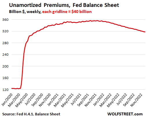 Unamortized premiums have dropped by $39 billion from the peak in November 2021, to $317 billion:
